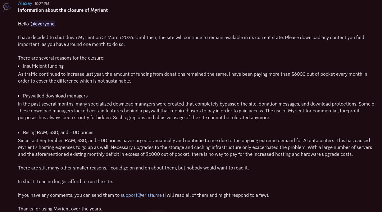 Messaggio inviato su Discord della chiusura definitiva di Myrient